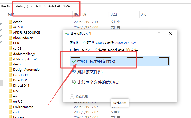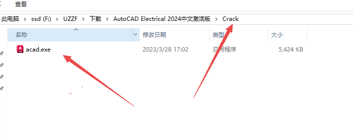 7、返回文件夹然后找到Crack文件夹里面的acad.exe程序,右键点击复制