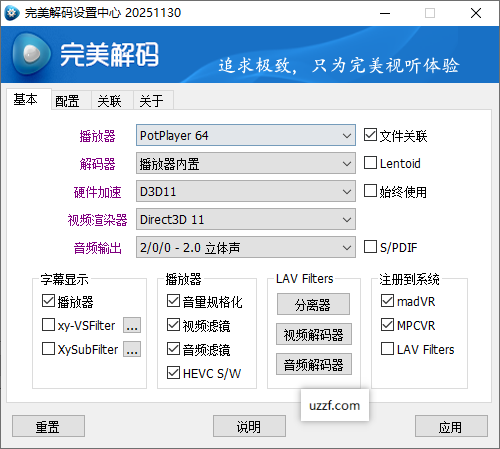完美解码:不是单一播放器,是整合包——内置PotPlayer(默认)、MPC?HC、MPC?BE三款播放器+LAV/MadVR/ffdshow等全套解码器、分离器、渲染器,主打全格式通吃、零配置、发烧级画质。