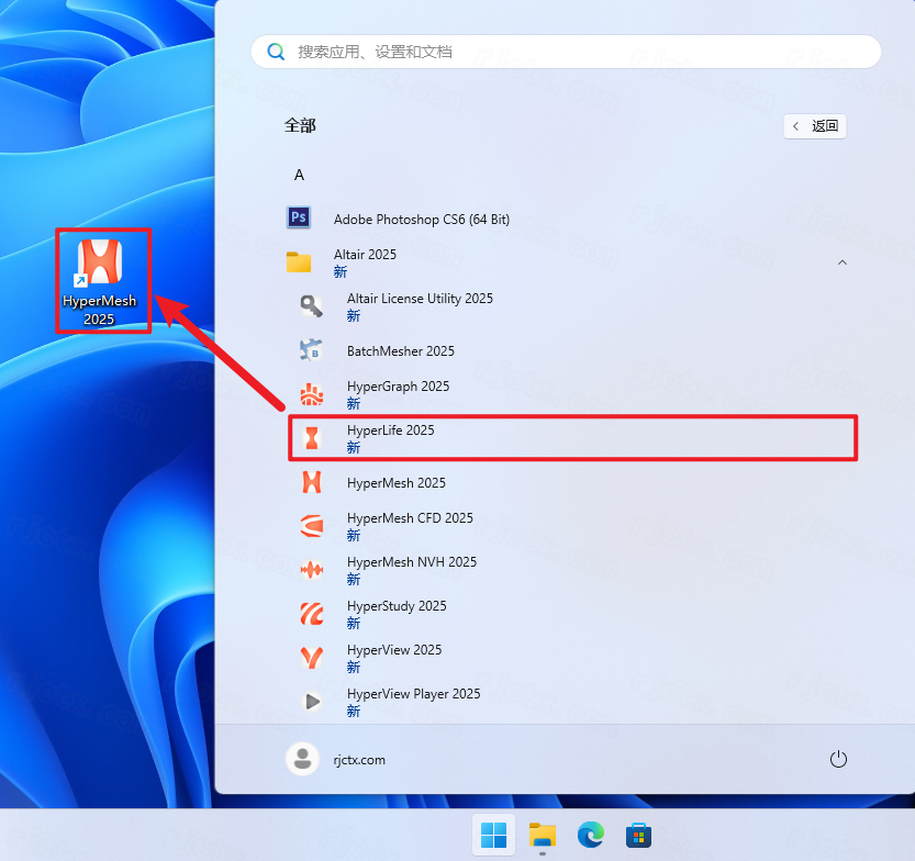23、回到桌面,点击任务栏的【开始菜单】,在【所有应用】中找到【HyperMesh 2025软件图标】,将软件图标拖到桌面上,完成软件桌面快捷方式的创建