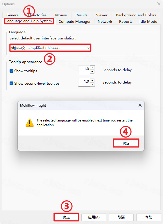 15、修改为中文语言:①点击【Language and Help System】②选择【简体中文】③点击【确定】④点击【确定】后重启软件