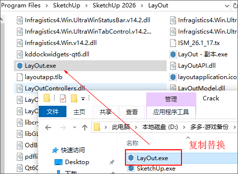 - 复制LayOut.exe文件替换到【C:\Program Files\SketchUp\SketchUp 2026\LayOut】