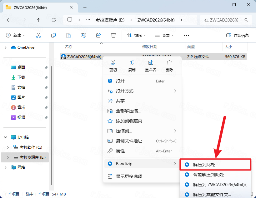 1.下载完成后,鼠标右击【中望CAD 2026】压缩包,选择【解压至此处】