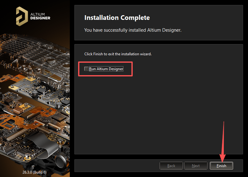 9、取消勾选【Run Altium Designer】,点击【Finish】。