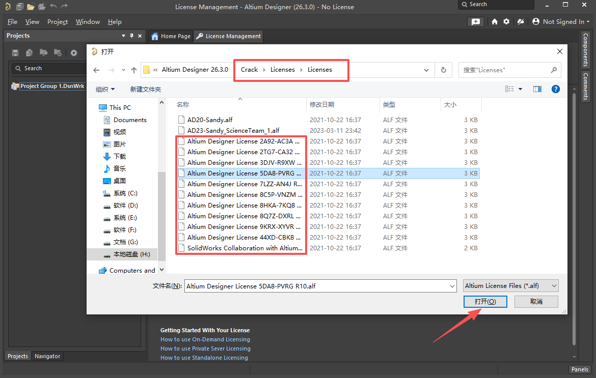 14、打开【Crack——Licenses——Licenses】文件夹,选择任意一个文件,点击【打开】。