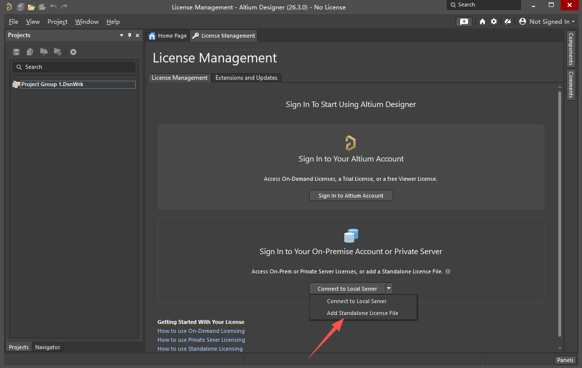 13、打开Altium Designer 26软件,点击【Add standalone license file】。