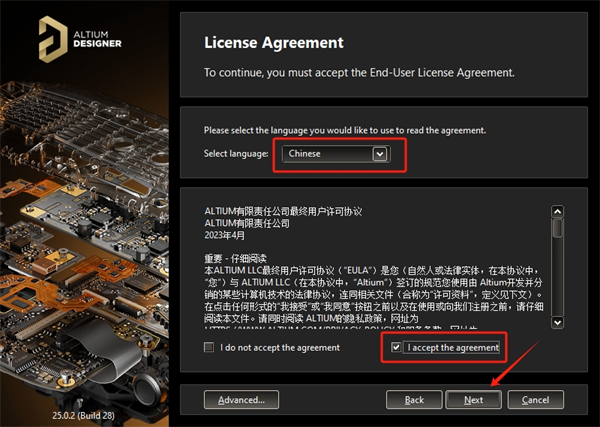 3、语言选择及软件许可协议接受,首先选择语言为:Chinese、然后勾选【 l accept the agreement】,接着点击Next。