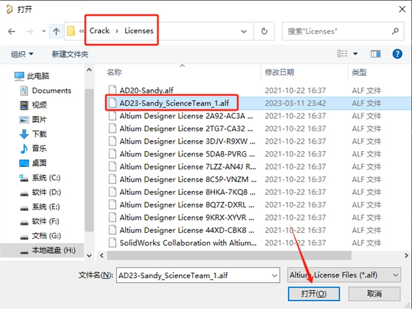 14、弹出窗口,找到软件安装包Crack\Licenses里面的AD23-Sandy_ScienceTeam_1.alf打开。