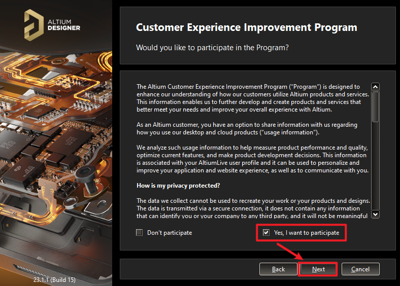 6、选择【Yes I want to participate】,点击【Next】。