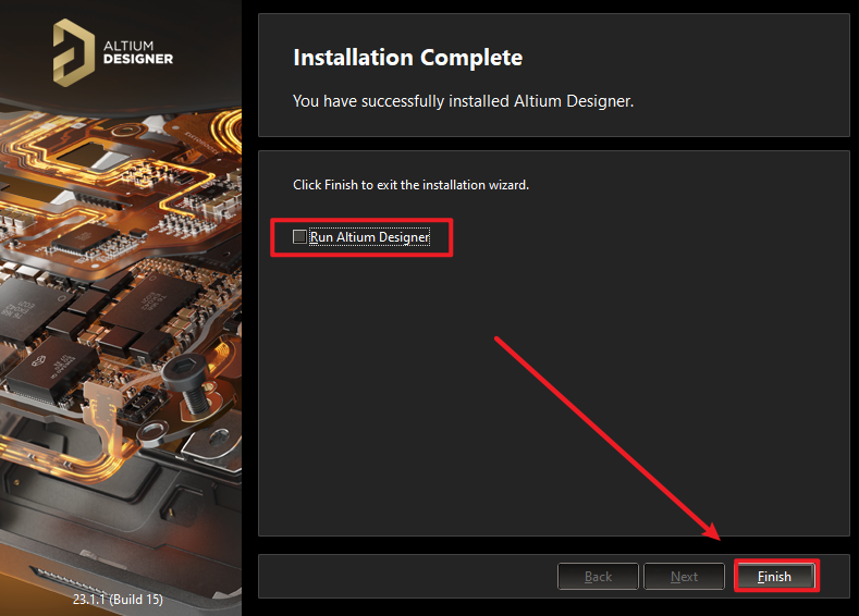 9、取消勾选【Run Altium Designer】,点击【Finish】。