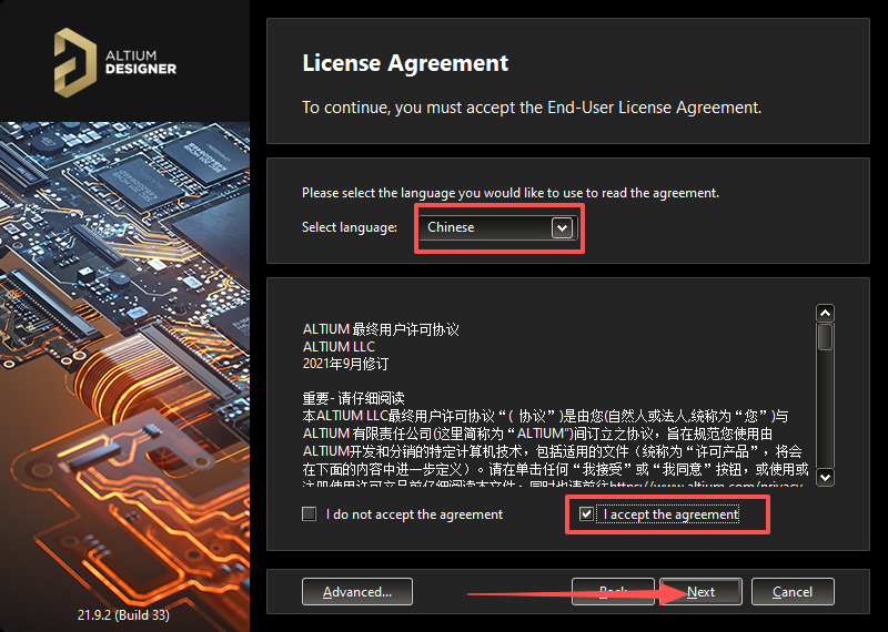 3、Select language选择【Chinese】,勾选【I accept the agreement】,点击【Next】。