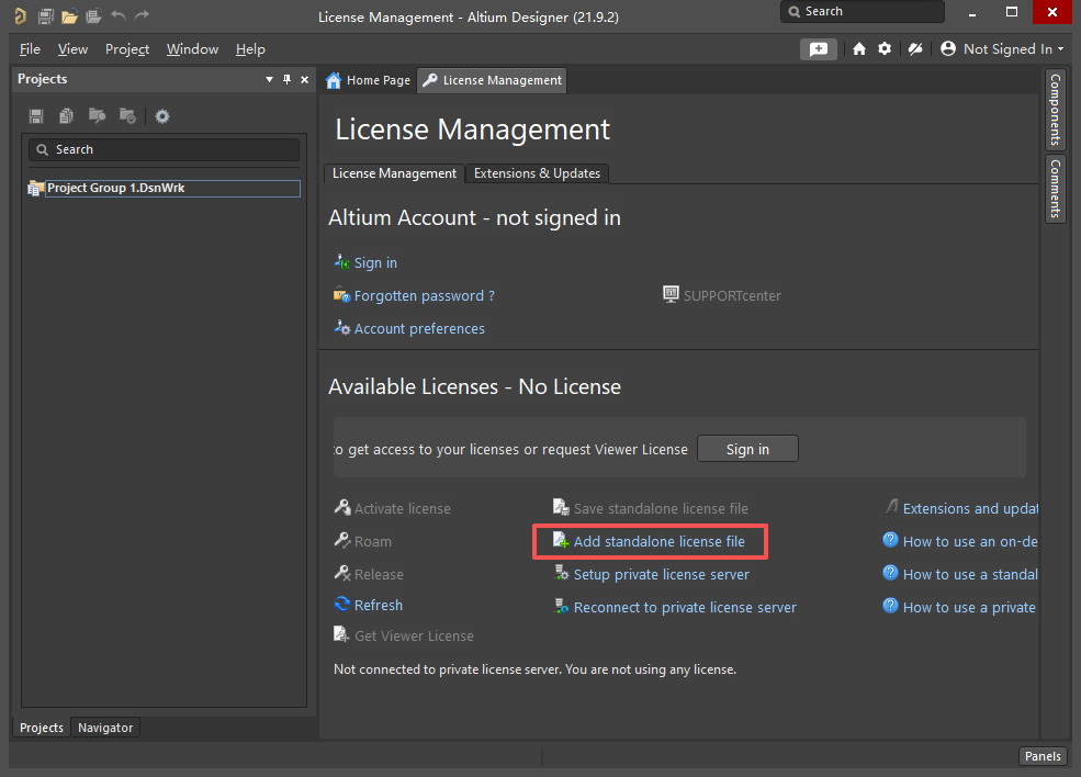 12、打开Altium Designer 21,点击【Add standalone license file】。