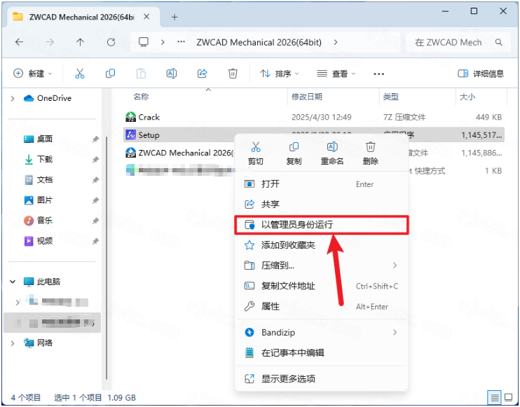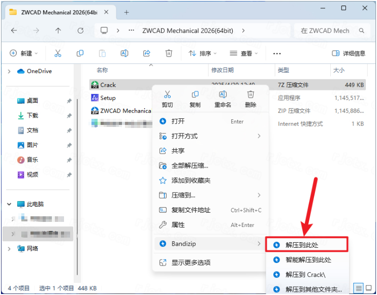 7.打开安装包解压后的【ZWCAD Mechanical 2026(64bit)】文件夹,①鼠标右击【Crack】压缩包②选择电脑上安装的解压软件③点击【解压到当前文件夹】