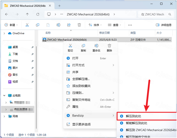 1.下载完成后,鼠标右击【中望CAD机械版2026】压缩包,选择【解压至此处】