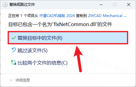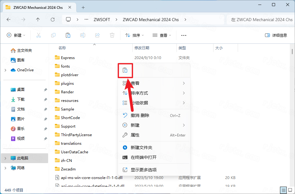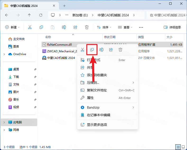 8.回到中望CAD机械版 2024文件夹,找到【flxNetCommon.dll】文件,右键点击【复制按钮】