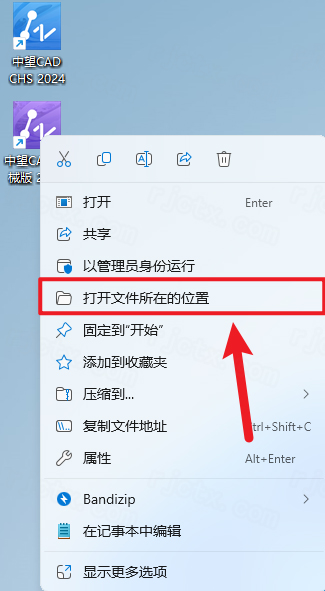 9.回到桌面,右键桌面上的【中望CAD机械版 2024软件图标】,点击【打开文件所在的位置】