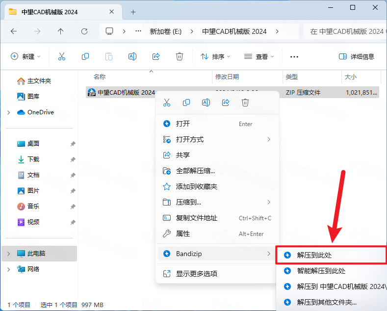 1.下载完成后,鼠标右击【中望CAD机械版 2024】压缩包,选择【解压至此处】