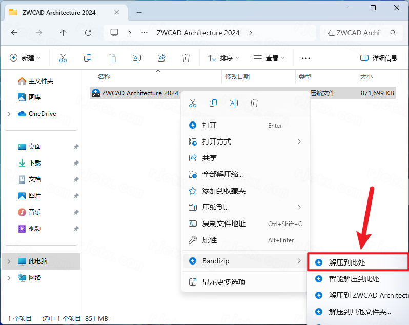 1.下载完成后,鼠标右击【中望CAD建筑版 2024】压缩包,选择【解压至此处】