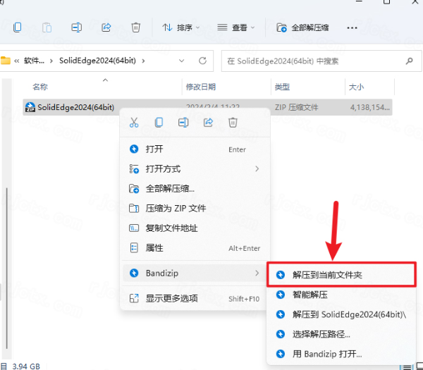 1.下载完成后,鼠标右击【Solid Edge2024(64bit)】压缩包,选择【解压到当前文件夹】