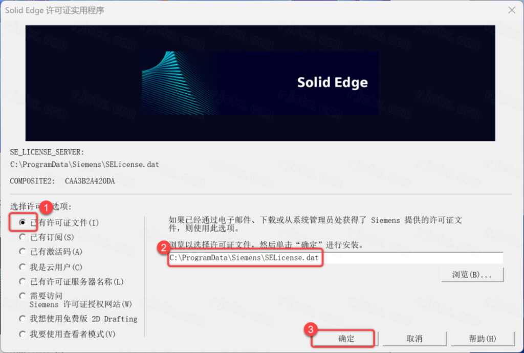 19.①选择【已有许可证文件】②输入【C:\ProgramData\Siemens\SELicense.dat】③点击【确定】