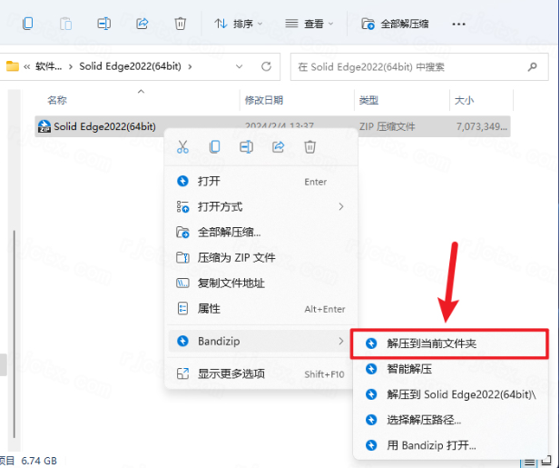 1.下载完成后,鼠标右击【Solid Edge 2022】压缩包,选择【解压到当前文件夹】