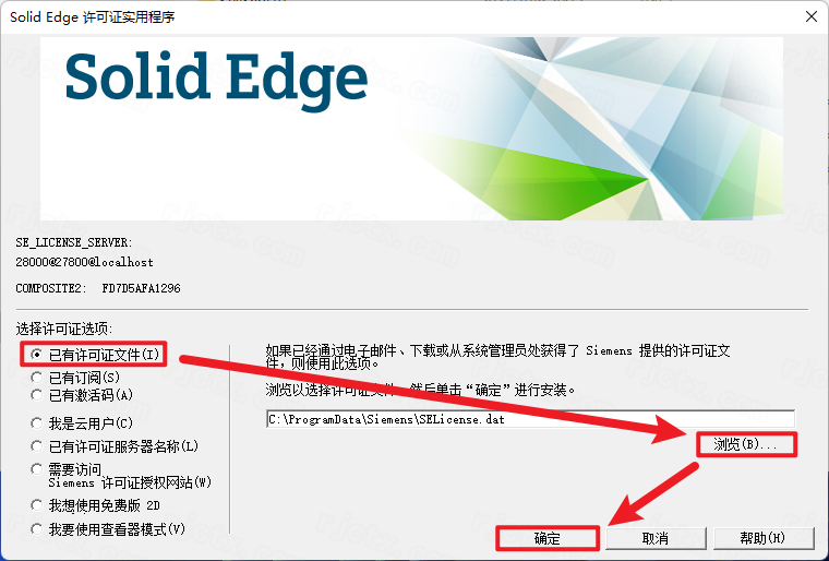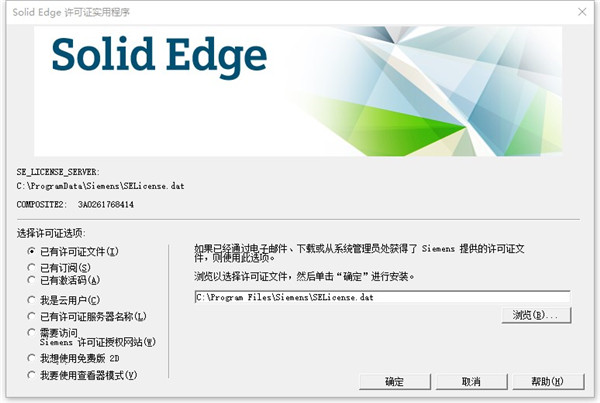 26.选择【已有许可证文件】将【C:\ProgramData\Siemens\SELicense.dat】复制到【浏览处】,点击【确定】