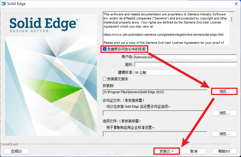 4.勾选【我接受许可协议中的条款】,点击【浏览】修改路径地址中的首字符C可更改软件的安装位置(如:将C改为D表示安装到D盘),点击【安装】