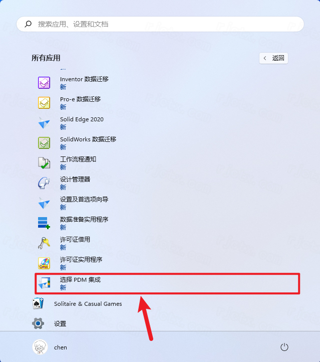 19.点击【开始】菜单,点击【所有程序】找到并点击【选择 PDM 集成】