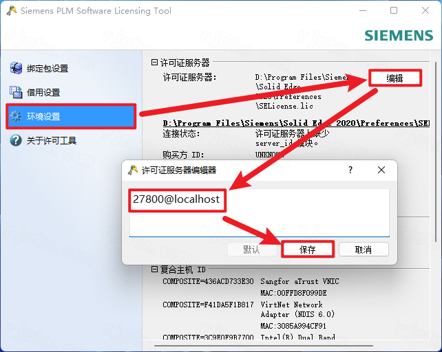 23.点击【环境设置】,点击【编辑】,输入【27800@localhost】,点击【保存】