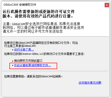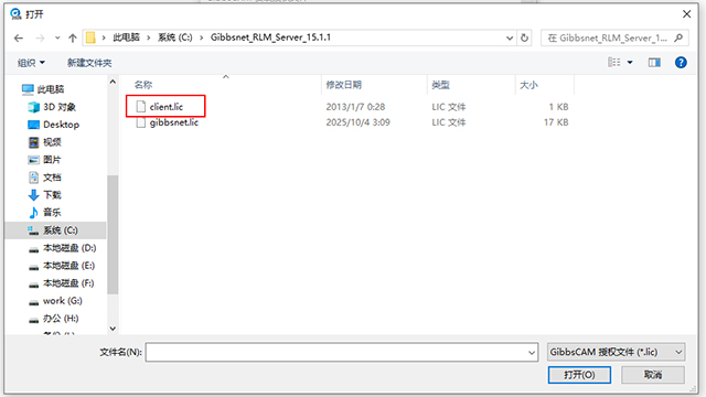 7、运行软件,在“Gibbscam许可证安装”窗口中单击“在此计算机上浏览您的许可证文件”>浏览到Gibbsnet_RLM_Server\client.lic>单击“打开”,这是你存放许可文件夹c盘根目录;