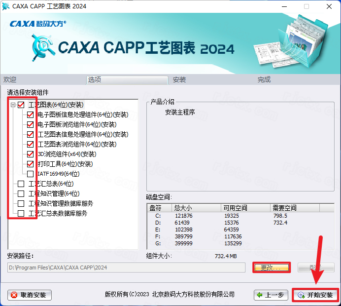 5.勾选需要安装的组件,点击【更改】可修改路径地址中的第一个字符C可更改安装位置(如:把C改为D软件将安装到D盘),点击【开始安装】