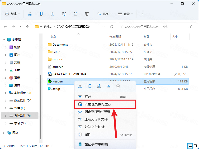 10.打开安装包解压后的文件夹,鼠标右击解压出来的【Keygen】选择【以管理员身份运行】