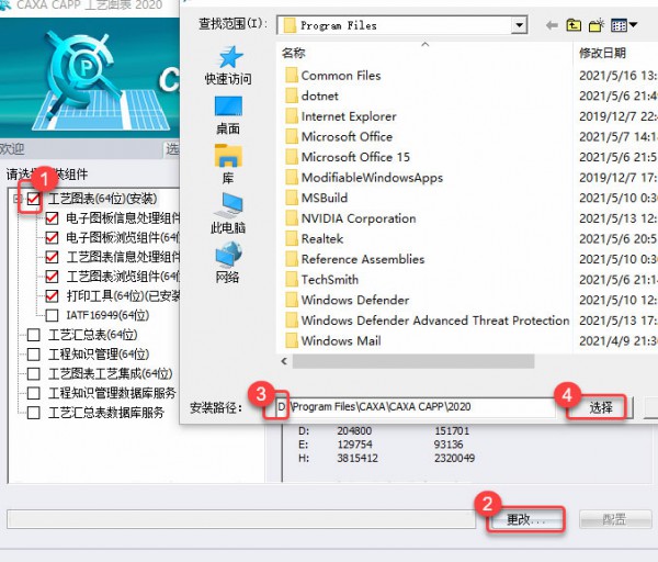 6、勾选工艺图表安装组件,点击更改,设置D盘为安装路径,点击选择要安装的文件夹。