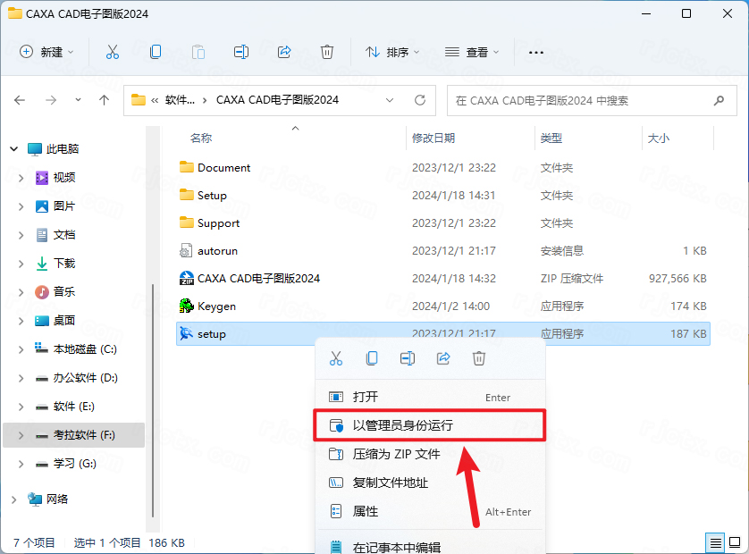 2.打开解压后的文件夹,鼠标右击【setup】安装程序,点击【以管理员身份运行】