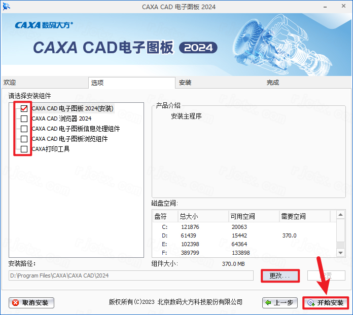5.勾选需要安装的组件,点击【更改】可修改路径地址中的第一个字符C可更改安装位置(如:把C改为D软件将安装到D盘),点击【选择】