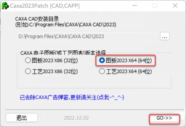 10、勾选图板2023 X64位,点击GO>>。