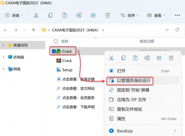 9、解压Crack压缩包,解压到当前文件夹。再鼠标右击Crack图标,点击以管理员身份运行。