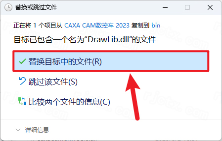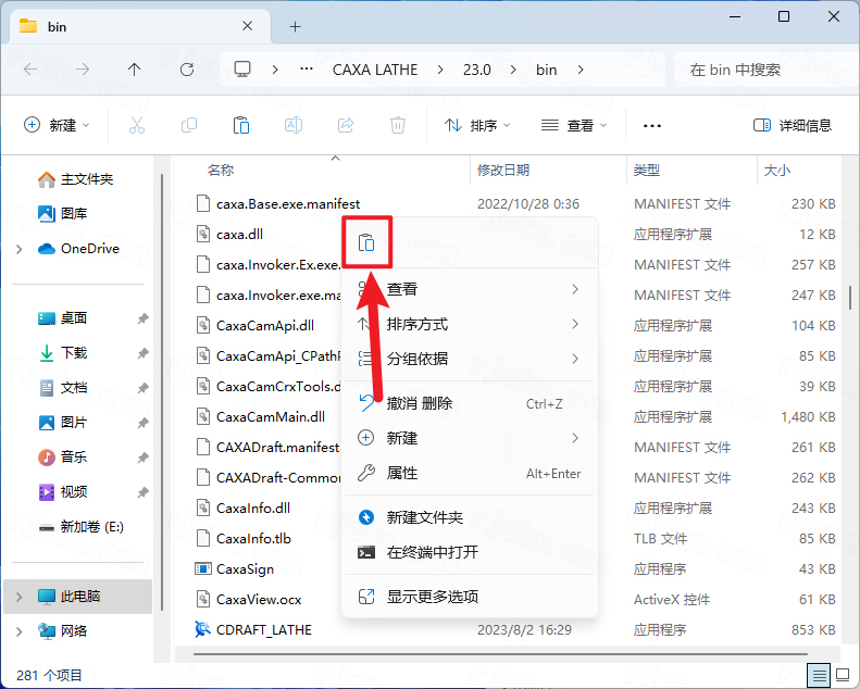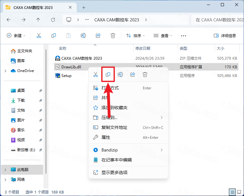 9.打开安装包解压后的【CAXA CAM数控车 2023(64bit)】文件夹,鼠标右击【DrawLib.dll】选择【复制】