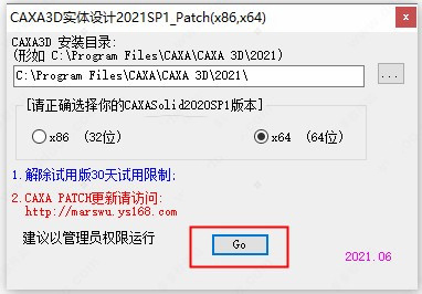 7、进入破解补丁界面,会自动找出CAXA实体设计2021的安装位置及对应版本,点击【Go】;