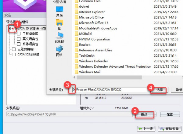 5、然后勾选安装组件,点击更改,设置D盘的文件夹,点击选择要想的文件夹。