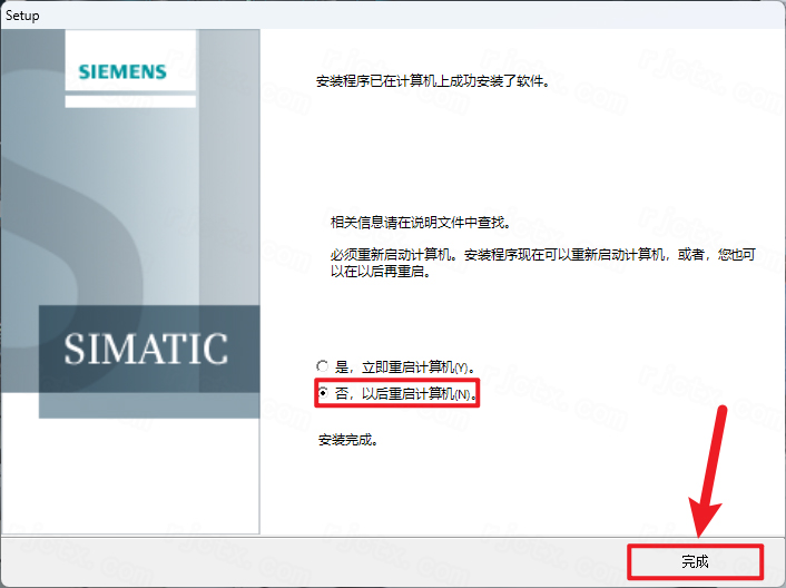 25.安装完成后,勾选【否,以后重启计算机】,点击【完成】
