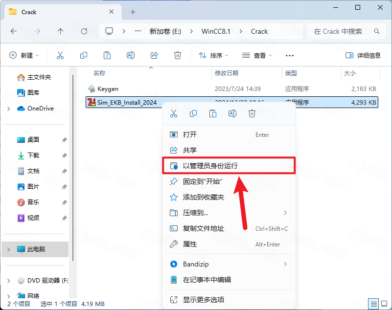 30.继续在打开的【【Crack】文件夹中,鼠标右击【Sim_EKB_Install_2024】选择【以管理员身份运行】
