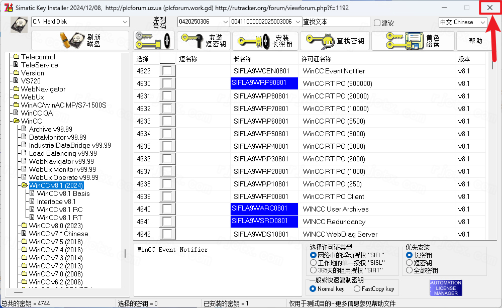 31.安装密钥:①鼠标双击展开【WinCC】②双击展开【WinCC v8.1(2024)】并点击【WinCC v8.1 Basis】③从第二项开始全部勾选④点击【安装长密钥】