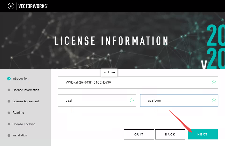 3、输入SERIAL NUMBER【VWEval-25-003F-31C2-E530】,输入【NAME、CONPANY】(可随便填写),点击【NEXT】
