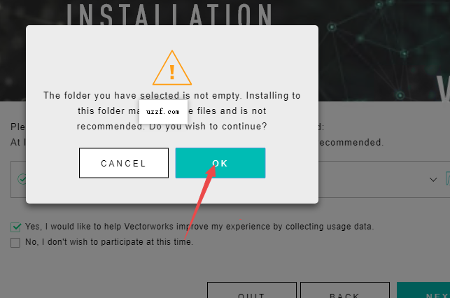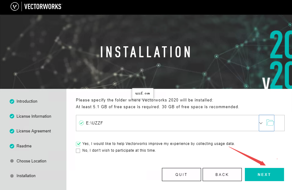 6、勾选【Yes,I would like to Vectorworks improve my experience by collecting usage data.】,点击【NEXT】(点击“文件夹图标”可更改安装位置:建议不要安装在C盘,可以在D盘或其它磁盘下新建一个“Vectorworks2020”文件夹。注:安装路径中不能有中文)
