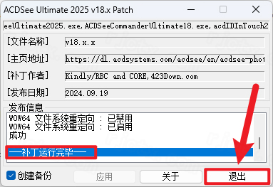11.提示”补丁运行完毕“,点击【退出】
