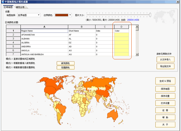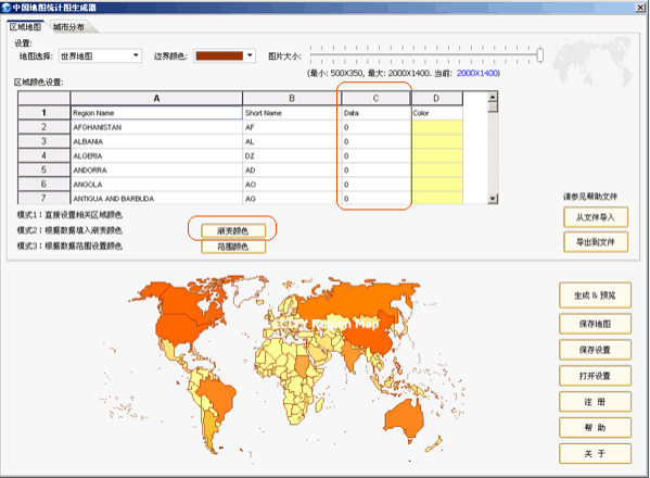 灵活的颜色设置。提供了2种颜色设置方式。既可以根据各省数据自动生成过渡色,也可以自定义颜色。