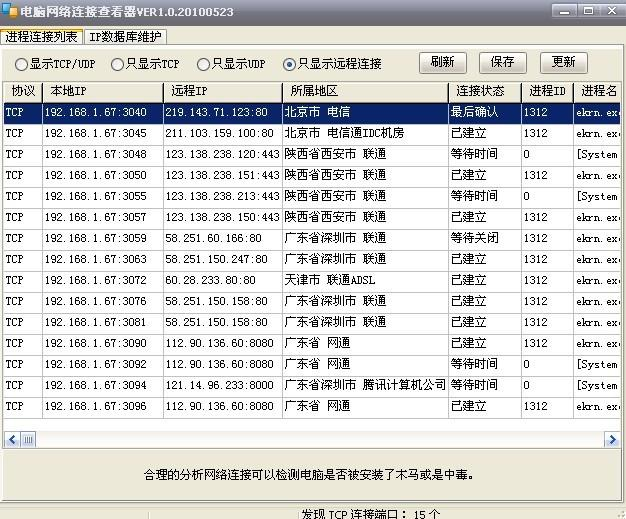 电脑网络连接查看器可以列出所有当前真正在执行程序的网络连接状态,TCP/IP和UDP连接同时显示程序打开的端口号,这个软件给我们提供的详细连接所在地区。