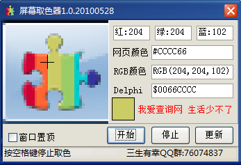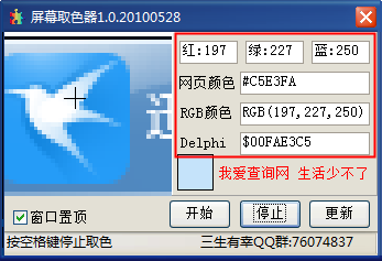 三生有幸屏幕取色器是一个绿色好用的屏幕取色工具,可以方便的捕获屏幕上喜欢的颜色,以多种格式显示:RGB分量格式、网页颜色格式、Delphi颜色格式。