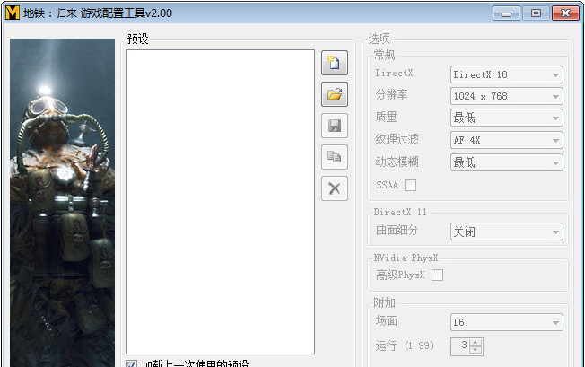 地铁回归配置工具是一款功能很强大的软件,能够在进游戏前完成设置,节约我们的时间,能更好的进行玩耍,你值得拥有!
