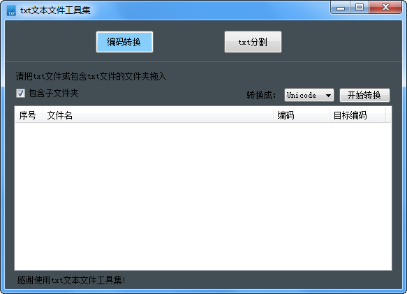 1、编码转换功能:一般中文操作系统电脑里的txt文件基本上都是ASNI编码,拷贝到手机、MP3、MP4等移动设备里面,因为编码问题,打开看到的都是乱码。所以我们必须先把它们转换为Unicode的编码格式,才能够在手机等移动设备上面正常打开。但是如果有大量的txt文件,一个一个打开然后再另存为Unicode编码类型太麻烦。txt文本文件工具集可以快速地将多个txt文本文件的ANSI编码转换成Unicode编码。也可以转换成UTF8等编码格式。